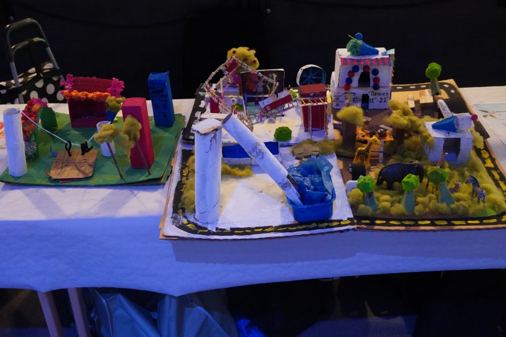 – Man använder en linbana som hissas upp och hissas ner klimatsmart. Det finns olika delar av tivolit, till exempel en djungel för avslappning, en vattenpark för bad, en foodcourt med klimatsmart mat där det kostar att slänga mat man köpt. Det finns också en historisk berg-och-dalbana. Mellan varje stopp så använder man en racecart för att ta sig fram.