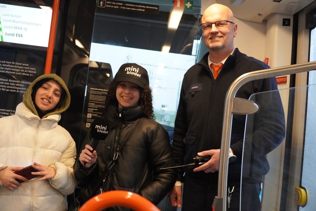 Minireportrar Baqia och Jasmin med spårvagnsförare Erik. Foto: Mozayan.