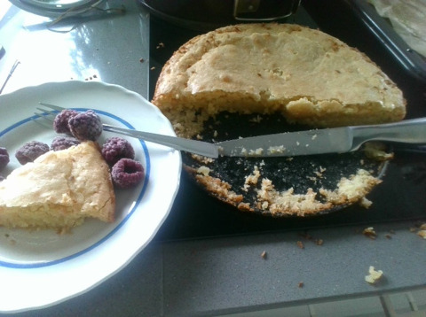 Sedan när den var klar i ugnen lät vi den svalna, och sedan toppade vi den med frysta hallon och silver chokladkulor och det var supergott!.